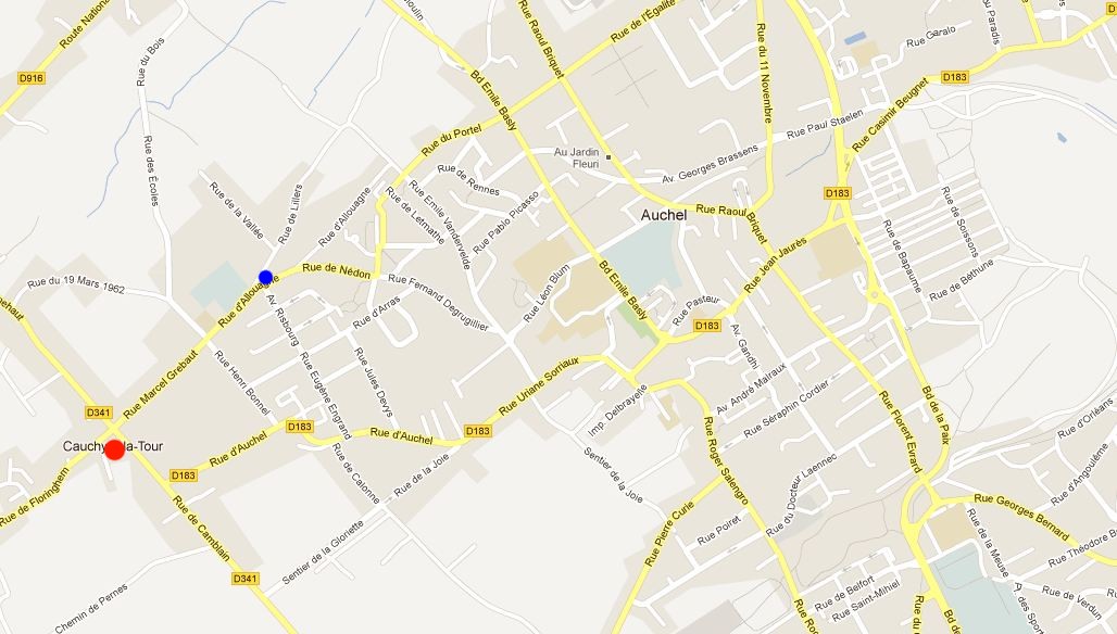 point rouge = place du village ( mairie et salle des fetes ) ...... point bleu = lieu du crime