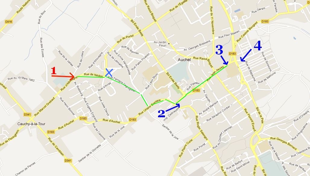 je place ce dessous un plan avec en trait vert le chemin supposé de Myriam Wuillaume ( eldorado --> place Guesdes ---> rue de lillers )